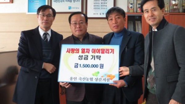 용인축협 상갈지점(지점장 황남석)은 5일 지역의 어렵고 소외된 이웃을 돕는데 써달라며 상갈동 주민센터에 사랑의 열차이어달리기 성금 150만원을 기탁했다. 황남석 지점장은 “어려운 경제 여건으로 모두가 힘든 시기에 지역의 소외된 불우이웃들에게 작으나마 도움이 될 수 있기를 바란다.” 며 “앞으로도 직원들의 마음을 모아 어려운 이웃을 위해 꾸…