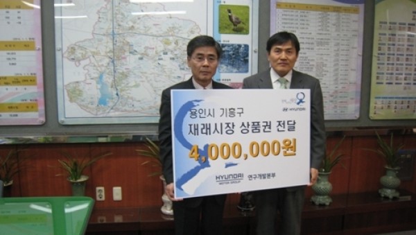 용인시 기흥구 마북동에 위치한 현대자동차(주) 연구소는 23일 기흥구청을 방문 “사랑의 열차 이어달리기”에 동참하기 위해 온누리상품권 4백만원을 기탁했다. 현대자동차(주) 연구소는 지난 2011년부터 매년 설과 추석을 맞이하여 300만원 ~500만원 상당의 상품권을 지속적으로 기탁, 이번 기탁금액까지 총 2,300만원에 달하는 상품권에 지…