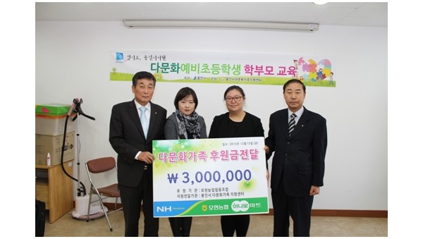 지난 12월 13일 '용인시 다문화가정지원센터를 찾은 모현농협 황종락 조합장은 모현면의 다문화여성을 위한 지원을 위해 후원금 3백만원을 전달하는 전달식을 가졌다. 다문화지원센터에서는 다문화여성의 한국생활 조기정착과 취업지원을 위한 맞춤형 한국어 교육, 가족교육, 상담, 문화프로그램운영을 통해 다문화 가족의 정착을 지원하고, 지역 공동체의 …