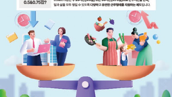 경기도와 경기도일자리재단은 4월 3일부터 도내 가족친화기업 재직 노동자를 대상으로 일·생활 균형 지원을 위한 ‘경기가족친화기업 0.5&0.75잡’ 참여자를 모집한다.‘0.5&0.75잡’은 가족 돌봄, 육아, 학업 등 다양한 사유로 근무시간 조정이 필요한 노동자를 대상으로 단축근무를 허용하고, 이에 따른 급여 감소분을 보전하는 제도다. 경기가족친화기업 경기도 소재 가족친화기업 재직자가 주 20~…