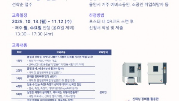 용인시산업진흥원(이사장 이상일)은 관내 소공인의 제품 신뢰성 확보와 기술 경쟁력 강화를 위해 ‘2025년 품질·신뢰성 검증 장비 활용 교육(하반기)’을 개설하고 참가자를 모집한다고 밝혔다. 교육 대상은 용인시 관내 소공인 대표와 재직자, 취업희망자이며, 전액 무료로 진행된다.품질신뢰성검증 장비활용 하반기교육 포스터이번 교육은 제품의 품질과 신뢰성 확보를 위한 이론부터 실습까지 다루는 특화 과정으로, 오는 10월 13일부터 매주…