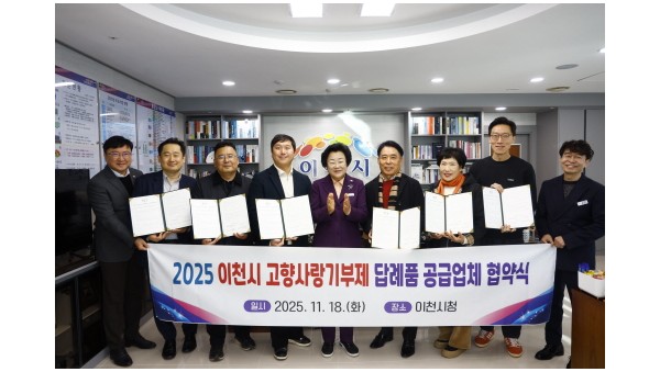 이천시(시장 김경희)는 11월 18일(화) ‘2025년 고향사랑기부제 답례품 공급업체 협약식’을 개최하고, 신규 공급업체 9개소와 총 14개 답례품 품목에 대한 공급 협약을 체결했다.이천시 고향사랑기부제 답례품 공급업체와 협약 체 시는 이번 협약을 통해 지역의 우수한 농·특산물과 가공품, 생활도자기 등 이천만의 특색을 담은 다양한 답례품을 새롭게 구성했으며, 기부자에게 더욱 폭넓은 선택권을 제공하는 한편 지역경제 활…