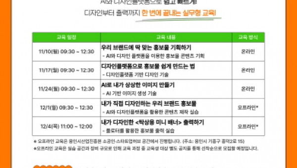 용인시산업진흥원(이사장 이상일)은 용인 소공인의 홍보 역량 강화를 위해 ‘AI 기반 홍보 콘텐츠 제작 실무과정 2기’를 개설하고 교육생을 모집한다고 밝혔다.AI기반 홍보 콘텐츠 제작 실무과정 교육 2기 포스터이번 과정은 AI를 활용한 콘텐츠 기획·디자인부터 플로터 장비를 활용한 실사 출…