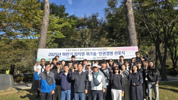 용인시산업진흥원(이사장 이상일)은 지난 10월 24일 용인시 처인구 모현읍에 위치한 용인산림교육센터에서 ‘2025년 하반기 임직원 워크숍’을 개최했다고 밝혔다.진흥원 임직원들이 인권경영 선포식을 하고 있다.이번 워크숍은 임직원 간 소통과 단합을 강화하고 청렴·인권 중심의 조직문화를 확산…