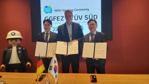 경기경제자유구역청은 독일 시험·인증 전문기관인 독일 티유브이슈드 코리아(TÜV SÜD Korea)가 약 700억 원을 투자해 평택 포승BIX지구에 전기차 및 에너지저장장치(ESS) 관련 시험·인증 인프라를 구축한다고 28일 밝혔다.사진 왼쪽부터 서정욱 TUV SUD KOREA…