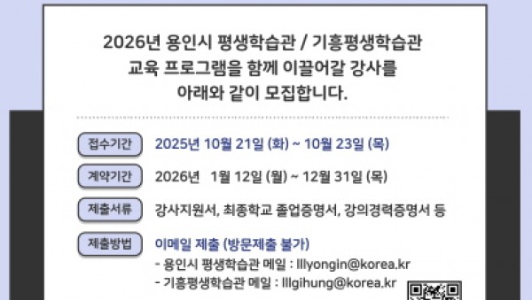 용인특례시(시장 이상일)는 21일부터 23일까지 3일간 ‘2026년 평생학습관 프로그램’을 운영할 강사를 모집한다고 15일 밝혔다.용인특례시 2026년 평생학습관 강사모집 안내 포스터이번 모집은 수지구 풍덕천동에 위치한 ‘용인시 평생학습관’과 기흥구 신갈동의 ‘기흥평생학습관’에서 각각 …