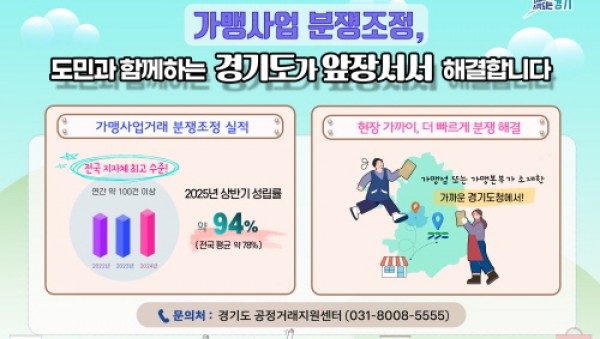 경기도가 가맹사업거래 분쟁조정에서 조정 절차를 통해 합의에 도달한 비율이 올 상반기 94%에 이르는 등 전국 최고의 성과를 내고 있다.그래픽보도자료지난 11일 개최된 ‘2025년 상반기 공정거래위원회-지방자치단체 간 성과 공유 간담회’ 자료에 따르면 경기도는 올 상반기 가맹점주와 본사간…