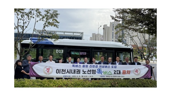 이천시(시장 김경희)는 9월 12일 이천시청 광장에서 시내권역 ‘노선형 똑버스’ 2대 증차를 기념하는 시승식을 개최했다고 밝혔다. 이날 개통식에는 김경희 시장, 박명서 시의회의장, 시도의원과 주요 사회단체장 등이 참석했다.1. 이천시 시내권 노선형 친환경 저상 똑버스 시승 행…