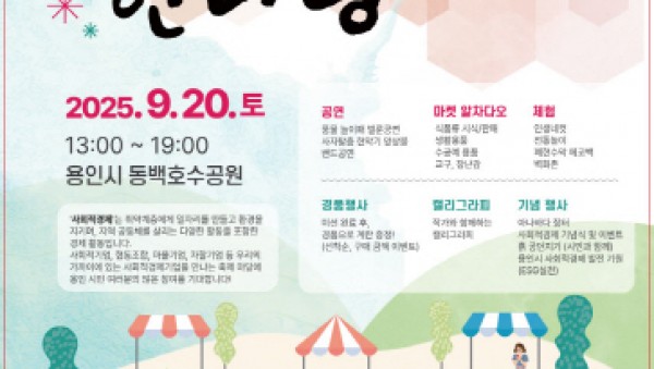 용인특례시(시장 이상일)는 오는 20일 오후 1시부터 7시까지 동백호수공원에서 ‘2025 용인시 사회적경제 한마당’을 개최한다고 12일 밝혔다. 제9회용인사회적경제한마당 포스터이번 행사는 ‘놀자, 느끼자, 나누자! 자연 속 사회적경제’를 주제로 사회적기업, 협동조합, 마을기업,…