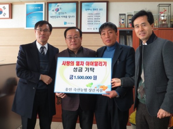 용인축협 상갈지점(지점장 황남석)은 5일 지역의 어렵고 소외된 이웃을 돕는데 써달라며 상갈동 주민센터에 사랑의 열차이어달리기 성금 150만원을 기탁했다. 황남석 지점장은 “어려운 경제 여건으로 모두가 힘든 시기에 지역의 소외된 불우이웃들에게 작으나마 도움이 될 수 있기를 바란다.” 며 “앞으로도 직원들의 마음을 모아 어려운 이웃을 위해 꾸…