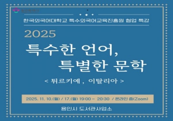 용인특례시(시장 이상일)는 11월 10일과 17일 온라인 줌을 통해 시민을 위한 온라인 인문학 강연 ‘특수한 언어, 특별한 문학’을 운영한다고 3일 밝혔다.용인특례시, 온라인 인문학 ‘특수한 언어, 특별한 문학’ 강연이번 강연은 한국외국어대학교 특수외국어교육진흥원과 협업한 프로그램으로 평소 접하기 어려운 튀르키예어와 이탈리아어권 문학을 통한 언어와 문화의 다양성을 탐구할 수 있는 자리다.첫 강연은 10일에 이난아 한국외대 튀르…