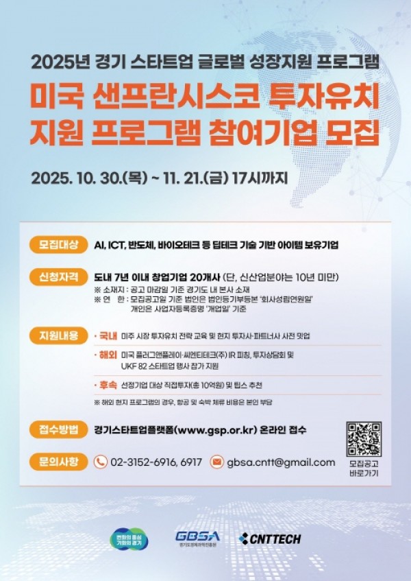 경기도와 경기도경제과학진흥원은 ‘2025년 경기 스타트업 글로벌 성장지원 샌프란시스코 투자유치 지원 프로그램’에 참여할 기업을 오는 21일까지 모집한다.샌프란시스코+모집+포스터이 사업은 미국 진출을 희망하는 우수 기술력을 갖춘 경기도 스타트업을 대상으로 투자유치 역량 강화 컨설팅을 제공하고, 현지 투자자를 대상으로 한 투자유치 활동을 지원하기 위해 마련됐다. 현지 투자자 및 기업인과의 교류를 통해 글로벌 시장 진출 가능성을 높…