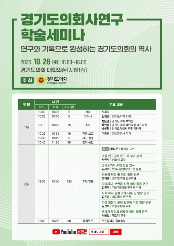 경기도의회는 28일(화) 도의회 대회의실에서 ‘경기도의회사 연구 학술세미나’를 개최했다.경기도의회사 연구 학술세미나 포스터이번 세미나는 경기도의회사 연구 성과를 공유하고 정책적 대안을 모색함으로써, 도민과 함께해온 의정활동의 역사를 기록·정립하기 위해 마련됐다.251028 경기도의회사 연구 학술세미나 개최...김진경 의장 “과거 성찰 통한 의정 미래비전 제시” (1)세미나에는 김진경 의장(더민주, 시흥3)을 비롯해 정윤경 부의…