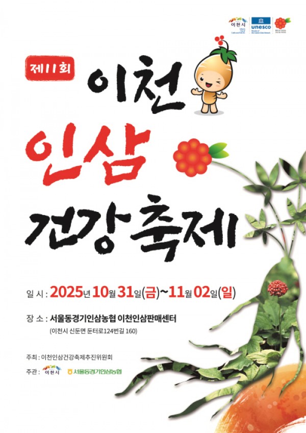 올해로 11회째를 맞이하는 ‘이천인삼축제’가 오는 10월 31일부터 11월 2일까지 3일간 이천인삼판매센터(신둔면 둔터로124번길 160) 일원에서 개최된다.6. 제11회 이천인삼축제 10월 31일 개막식 개최 ‘행복나눔 이천인삼, 건강나눔 이천인삼’이라는 슬로건으로 펼쳐지는 이번 축제는 체험, 공연, 전시 등 다양한 프로그램을 즐길 수 있으며, 인삼 수확 시기를 맞아 6년근 인삼을 만날 수 있다.&nbs…