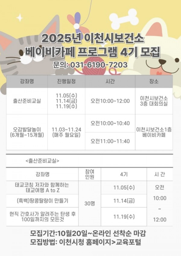 이천시(시장 김경희)는 임산부 및 6개월~15개월 영아의 보호자를 대상으로 10월 20일부터 ‘베이비카페 프로그램 4기’ 대상자를 선착순으로 모집 중이다. 온라인 신청(이천시청 누리집-교육포털-교육 강좌 신청)을 통해 선착순으로 접수하며 오감 발달 놀이의 경우 각 12명씩을 모집한다. 3. 오감 발달 놀이부터 출산 준비 교실까지 이천시 베이비카페 4기 운영 이번 프로그램은 오감 발달 놀이와 출산 준비 교실로…