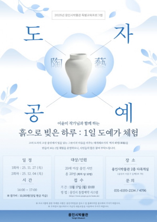 용인특례시(시장 이상일)는 11월 27일부터 12월 4일까지 용인시박물관에서 매주 목요일 오후 2~5시 두 차례에 걸쳐 ‘흙으로 빚은 하루 : 1일 도예가 체험’을 운영한다고 9일 밝혔다.도예가 체험 프로그램 포스터이번 프로그램은 어윤미 작가와 함께 백자 화병을 직접 만들어보는 참여형 교육으로, 흙을 다루며 고려 도자의 빛과 멋을 느낄 수 있는 기회를 제공한다. 참가자들은 흙이 화병으로 빚어지는 과정을 체험하면서 마음을 비우고…