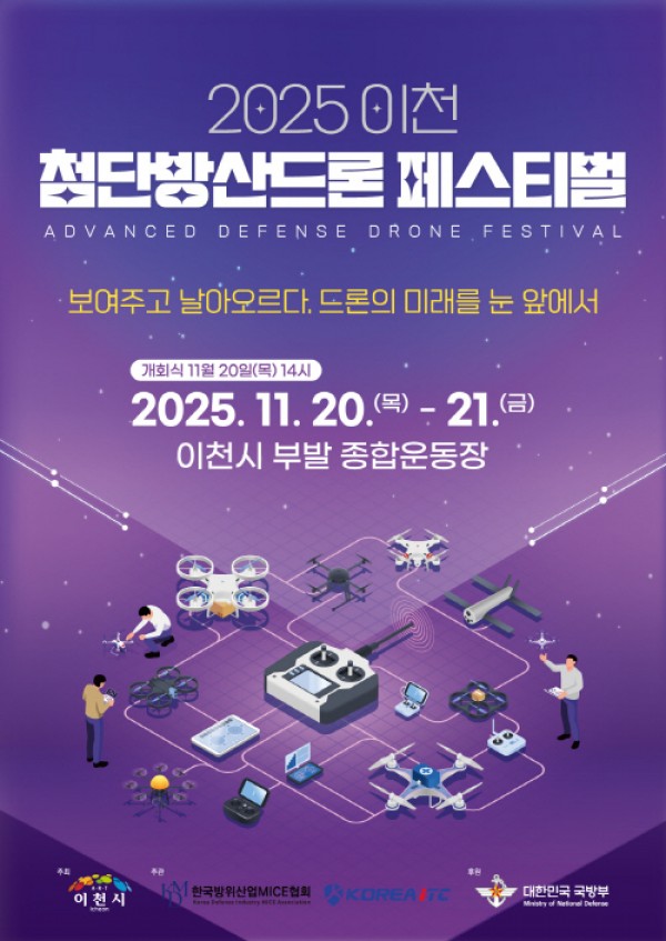이천시(시장 김경희)는 ‘이천의 하늘이 바뀌면, 대한민국의 산업 지도가 바뀔 것’이라는 비전을 가지고 드론페스티벌을 연다. 1. 이천시 2025 이천 첨단방산드론 페스티벌 개최 이천시(시장 김경희)는 오는 11월 20일(목)부터 21일(금)까지 이틀간, 부발읍 종합운동장(무촌리 52) 일원에서 ‘2025 이천 첨단방산드론 페스티벌’을 개최한다. 개막식은 11월 20일 14:00로 드론의 미래를 보는 첫걸음을…