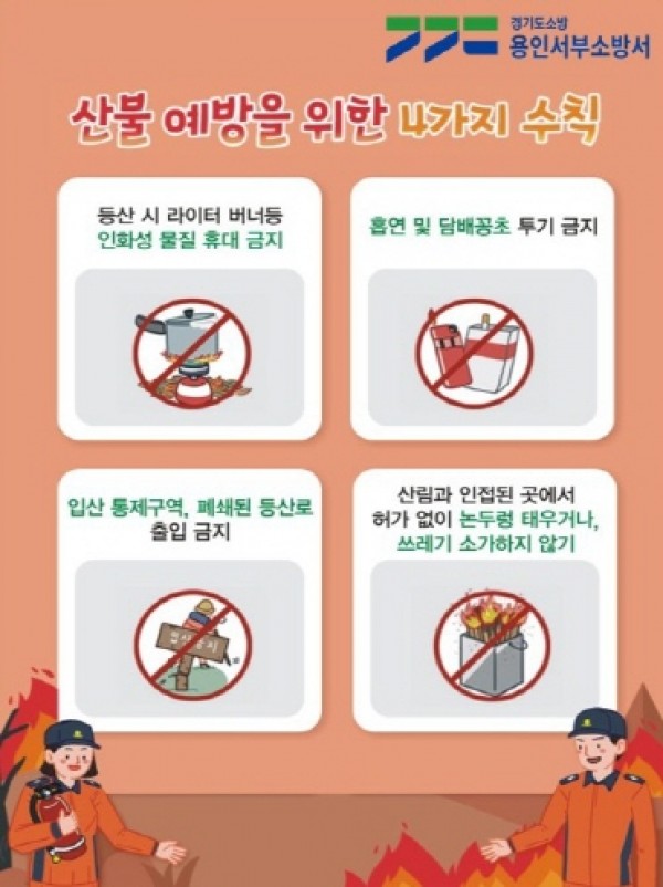 용인서부소방서는 지난 11월 10일 산불재난 국가위기경보 ‘주의’ 단계 발령에 따라 18일 광교산 일대 산불위험지역 현장 점검을 실시했다.포스터(산불 안전수칙)이번 점검은 건조한 날씨와 낙엽 증가로 산불 위험이 높아진 상황에서 관내 주요 산림지역의 화재 취약요인을 사전에 확인하기 위해 추진됐다.용인서부소방서, 산불위기 ‘주의’ 발령에 따른 광교산 현장점검 실시소방서는 백운산~광교산 구간을 중심으로 ▲산림 인접 식당·펜션 등의 화재위험요인 ▲산불 발생 시 소방차 진입 가능 여부 ▲출동로 장애요인 ▲산불 확산 우려지역 등을 집중 점검했…