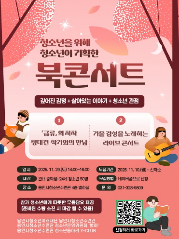 재단법인용인시청소년미래재단(이사장 이상일) 용인시청소년수련관 소속 청소년운영위원회 ‘별하’와 청소년동아리가 오는 29일(토) 청소년이 직접 기획하고 운영하는 「북콘서트」를 진행한다. 이번 행사는 청소년이 직접 프로그램을 구성하고 만나고 싶은 작가를 초청하며, 동아리 활동과 연계하여 진행되는 특별한 문화 체험으로 관심을 모으고 있다.청소년운영위원회 ‘별하’ 위원들은 행사 기획과 운영 전반을 주도하며 참가자들이 책과 문화를 보다 흥미롭게 경함할 수 있도록 프로그램을 구성했다. 참여 청소년들은 작가와의 질의응답, 토…