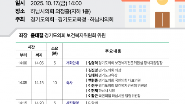 경기도의회 보건복지위원회 윤태길 의원(국민의힘, 하남1)은 오는 10월 17일(금) 오후 2시, 하남시의회 의정홀(지하 1층)에서 「학령인구 감소 시대, 경기도 교육의 지속가능한 대응전략을 모색하다」를 주제로 정책토론회를 개최한다. 이번 토론회는 학령인구 감소에 따른 소규모학교 증가, 학교 통폐합, 지역 간 교육격차 확대 문제에 대응하고, 경기도 교육의 지속가능한 발전 방향을 마련하기 위해 기획됐다.행사는 경기도의회,…