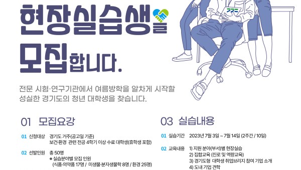 경기도보건환경연구원이 6월 5일부터 16일까지 하계 현장실습에 참여할 대학생을 모집한다.이번 실습 프로그램은 코로나19 이후 전국 보건환경연구원 최초로 실시하는 대학생 대상 현장실습으로 7월 3일부터 14일까지 2주간 운영된다. 실습생들은 공공 시험·연구기관 현장실습을 통해 실무 경험을 쌓을 수 있을 뿐 아니라 다양한 진로 및 역량 향상 교육 등도 받을 수 있다.경기도보건환경연구원+2023+현장실습생+모집+포스터모집인원은 총…