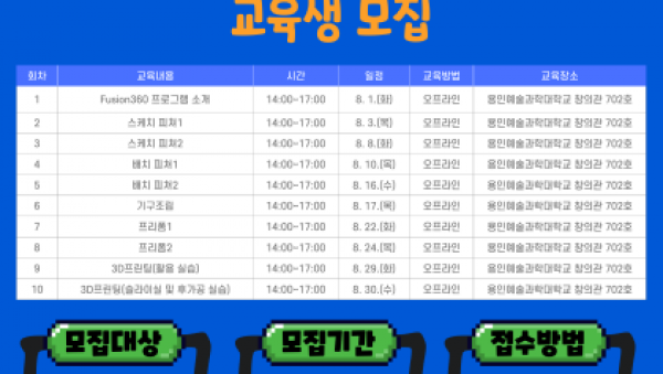 용인시산업진흥원(이사장 이상일, 이하 진흥원)이 용인 관내 소공인 임직원, 시민, 학생을 대상으로 ‘2023년 소공인 전문성 강화교육’에 참여할 교육생을 오는 26일까지 모집한다고 밝혔다.Fusion360을 활용한 3D모델링 및 3D프린팅 교육생 모집 홍보게시물 &n…