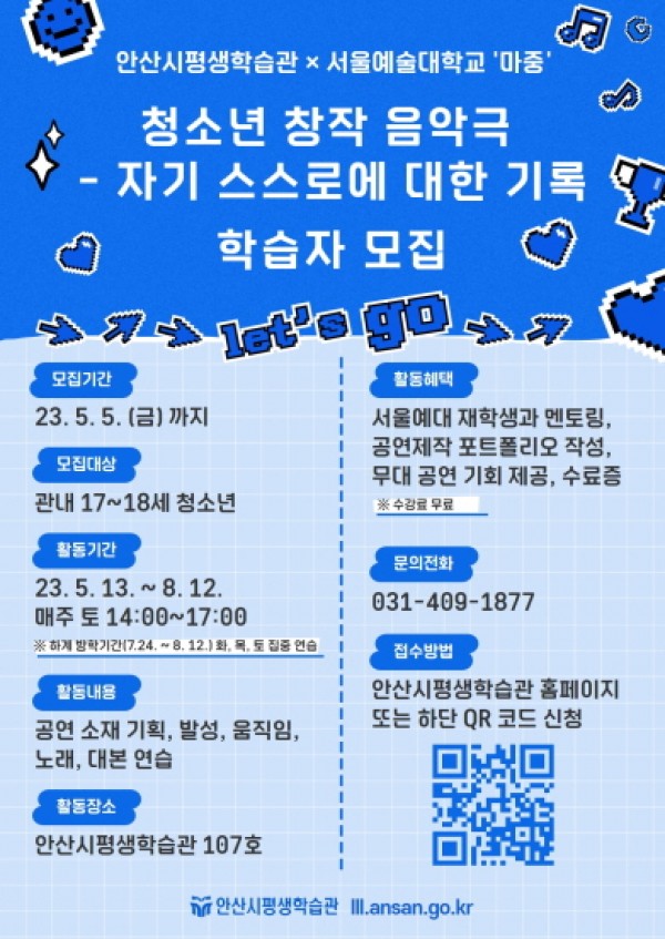 안산시평생학습관(관장 신영철)은 오는 5월 13일 청년프로젝트 청썰팅 프로그램으로 서울예술대학교 재학생과 함께 ‘청소년 창작 음악극’을 운영한다고 밝혔다. ‘청소년 창작 음악극’은 서울예술대학교 연극과와 극작과 재학생으로 구성된 사회봉사자치기구 ‘마중’이 멘토가 되어 참여 청소년들이 ‘나’를 주제로 함께 음악극을 만드는 문화예술 프로그램이다. 5월 13일부터 8월 12일까지 공연 소…