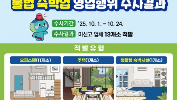 숙박업 신고 없이 오피스텔, 주택 등에서 영업을 한 불법 숙박업체 13곳이 경기도 특별사법경찰단 수사에 적발됐다.그래픽경기도 특별사법경찰단은 10월 1일부터 24일까지 고양, 부천, 성남, 화성, 안양, 김포, 용인, 파주 등 8개 지역에서 불법영업으로 의심되는 숙박업소에 대한 단속을 …