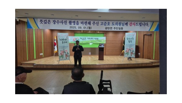 경기도의회 고준호 의원(국민의힘, 파주1)은 2일(화) 파주시 조리읍에서 열린 장수사진 증정식에 참석해 어르신들께 직접 사진을 전달하며 따뜻한 마음을 전했다. 이번 장수사진 사업은 경기도 비영리민간단체 공익활동 지원사업의 일환으로 진행된 것으로, 광탄·조리읍 어르신들에게 사진 촬영과 더불어 노래·춤이 어우러진 문화 프로그램까지 함께 제공됐다. 이번 행사는 지난달 조리읍에서 촬영한 어르신들의 사진을 전달하는 자리였다.액자를 받은…