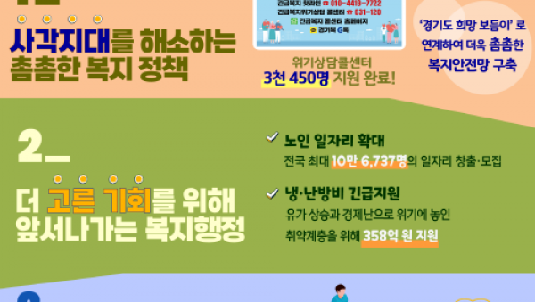 민선 8기 경기도는 올해 긴급복지 핫라인, 취약계층 냉난방 긴급지원, 장애인 누림통장 등 적극적이고 선제적 복지정책으로 든든하고 촘촘한 복지울타리를 만들기 위해 노력했다. 도의 이런 기조는 최근 360° 전방위 돌봄이라는 새로운 복지정책 패러다임으로 연결되며 경기도의 복지 그물망을 더욱 촘촘하게 만들었다. 긴급복지 핫라인부터 360°돌봄까지 경기도가 추진 중인 복지정책 추진 상황을 살펴봤다. ■ 경기도만의 …