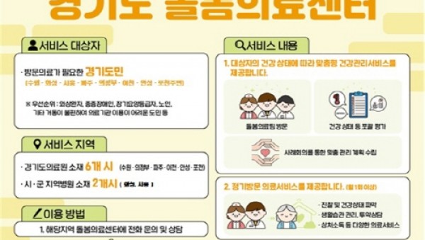 경기도가 9월 30일부터 10월 28일까지 경기도의료원 산하 5개 병원에서 ‘찾아가는 경기도 돌봄의료센터’ 비전 선포식을 열고, 도민이 집에서도 건강하게 지낼 수 있는 돌봄의료의 새로운 도약을 선언한다. 돌봄의료센터+포스터이번 행사는 의정부병원(9월 30일)을 시작으로 파주병원(10월 16일), 포천병원(10월 22일), 안성병원(10월 27일), 이천병원(10월 28일)에서 순차적으로 진행된다. 수원병원은 지난 8월…