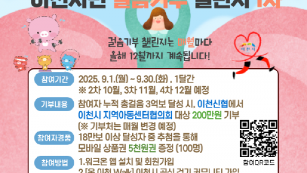 이천시(시장 김경희)는 모바일 걷기 앱 ‘워크온(Walk on)’을 활용해 진행 중인 ‘이천신협과 함께하는 이천시민 걸음기부 챌린지 1차’에서 시민들의 적극적인 참여로 목표 걸음 수 3억 보를 조기 달성했다고 9월 22일 밝혔다.9. 이천시민 걸음기부 1차 챌린지 목표 3억 보 달성 이번 챌린지는 “걸음으로 건강채움, 마음 나눔”이라는 슬로건 아래 시민들의 건강생활 실천과 지역사회 나눔 문화 확산을 위해 9월 1일부…