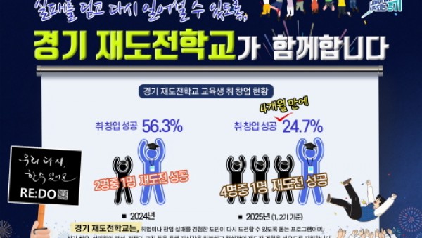 경기도는 올해 ‘경기 재도전학교’의 교육생 약 25%가 교육 수료 4개월 만에 취업 또는 창업에 성공했다고 23일 밝혔다.그래픽보도자료_경기재도전학교‘경기 재도전학교’는 취업이나 창업 실패를 경험한 도민이 다시 도전할 수 있도록 돕는 프로그램이다. 심리 치유, 실패원인 분석, 전문가 코…
