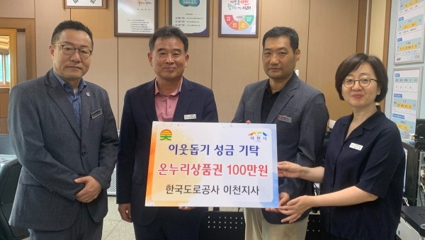 한국도로공사 이천지사(지사장 남수환)는 25일 추석 명절을 앞두고 소외계층에게 전해달라며 100만원 상당의 온누리상품권을 대월면행정복지센터에 기탁했다. 한국도로공사 이천지사는 매년 명절마다 지역 소외계층을 위한 이웃돕기 성금을 기탁하는 등 이웃사랑을 실천해오고 있다. 한국도로…