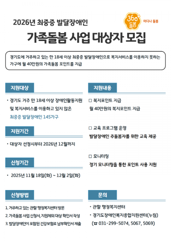 경기도가 2026년 최중증 발달장애인 가족돌봄 사업 대상자 145가구를 12월 2일까지 모집한다. 인터넷+배너최중증 발달장애인이란 도전적 행동이 심하고 일상생활에 제약을 지닌 통합돌봄이 필요한 발달장애인이다. 경기도는 돌봄이 필요한 모든 도민들을 대상으로 누구나, 언제나, 어디나 빈틈없는 돌봄을 제공하는 360도 돌봄사업을 하고 있다. 최중증 발달장애인 가족돌봄 사업은 이 가운데 ‘어디나 돌봄’ 사업의 하나로 진행한다…