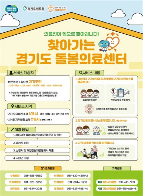 경기도가 9월 30일부터 10월 28일까지 경기도의료원 산하 5개 병원에서 ‘찾아가는 경기도 돌봄의료센터’ 비전 선포식을 열고, 도민이 집에서도 건강하게 지낼 수 있는 돌봄의료의 새로운 도약을 선언한다. 돌봄의료센터+포스터이번 행사는 의정부병원(9월 30일)을 시작으로 파주병원(10월 16일), 포천병원(10월 22일), 안성병원(10월 27일), 이천병원(10월 28일)에서 순차적으로 진행된다. 수원병원은 지난 8월…