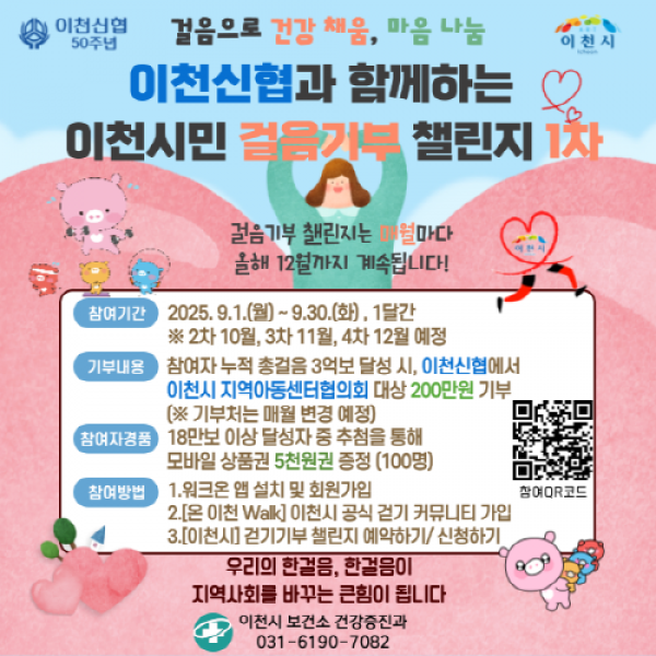이천시(시장 김경희)는 모바일 걷기 앱 ‘워크온(Walk on)’을 활용해 진행 중인 ‘이천신협과 함께하는 이천시민 걸음기부 챌린지 1차’에서 시민들의 적극적인 참여로 목표 걸음 수 3억 보를 조기 달성했다고 9월 22일 밝혔다.9. 이천시민 걸음기부 1차 챌린지 목표 3억 보 달성 이번 챌린지는 “걸음으로 건강채움, 마음 나눔”이라는 슬로건 아래 시민들의 건강생활 실천과 지역사회 나눔 문화 확산을 위해 9월 1일부…