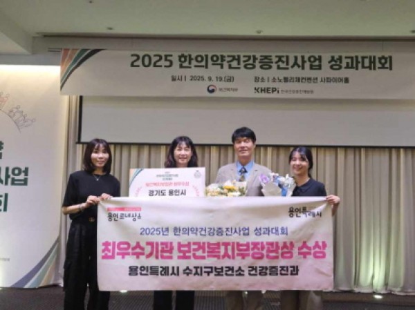 용인특례시(시장 이상일) 수지구보건소는 지난 19일 보건복지부와 한국건강증진개발원 주관 ‘2025년 한의약건강증진사업 성과대회’에서 최우수기관으로 선정돼 보건복지부장관 표창을 수상했다. 수지구보건소는 지난 19일 ‘2025년 한의약건강증진사업 성과대회’에서 최우수기관으로 선정됐다수지구보건소는 지역주민을 대상으로 아동, 청소년, 갱년기, 노인 등 주요 생애주기별 맞춤형 한의약 프로그램을 지속적으로 개발해 제공해 왔다.&…
