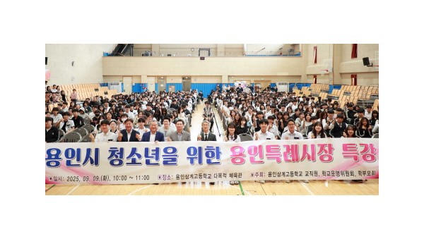 이상일 용인특례시장은 9일 오전 용인삼계고등학교 4층 강당에서 '관찰하고 상상하고, 물음을 던져라'라는 주제로 1시간 30분 가량 특강을 했다. 9일 용인삼계고에서 이상일 시장이 특강 후 학생들과 기념사진을 촬영하고 있다 이날 강의엔 용인삼계고 2~3학년 학생 500여 명과 학부모 40여 명이 참석했으며, 1학년 학생들은 각 교실에서 방송으로 강연을 시청했다. 류용걸 용인삼계고 교장은 "이상일 시장은…
