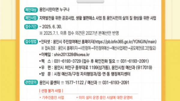 용인특례시(시장 이상일)는 2026년 본예산 반영을 위해 3월부터 6월까지 주민의견사업 집중 접수기간을 운영한다고 5일 밝혔다.용인특례시 주민의견사업 접수 안내 포스터 이는 ‘2025년 주민참여예산제 운영계획’에 따른 것으로, 시민이 제안한 공공사업, 지역 내 불편사항 개선 의견 등은 심사 과정을 거쳐 내년도 예산에 반영될 예정이다. 용인 시민이라면 누구나 참여할 수 있으며 용인시 홈페이지(주민참여…
