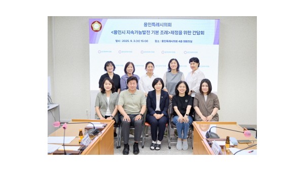 용인특례시의회 신현녀 의원(구성동·마북동·동백1·2동/더불어민주당)은 3일 의회 대회의실에서 ‘용인시 지속가능발전 기본 조례 제정을 위한 간담회’를 열고 조례 제정 방향과 주요 내용을 논의했다.용인시 지속가능발전 기본 조례 제정을 위한 간담회 참석자들이 기념촬영을 하고 있다.간담회에는 …