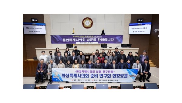 용인특례시의회(의장 윤원균)은 18일 오후 2시 화성시의회에서 용인특례시의회를 벤치마킹하기 위해 방문했다고 밝혔다.의원연구단체 화성특례시의회 준비 연구회, 용인특례시의회 방문 이날 윤원균 의장을 비롯한 용인특례시의회 의원들과 김경희 화성시의회 의장, 화성시의회 의원연…