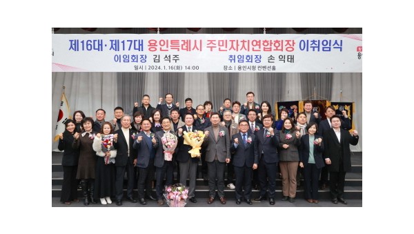 이상일 용인특례시장은 지난 16일 시청 컨벤션홀에서 열린 제16‧17대 주민자치연합회장 이취임식에 참여해 관계자들을 격려했다. 이상일 용인특례시장이 지난 16일 주민자치연합회장 이취임식에서 참가자들과 기념촬영을 하고 있다 이날 제17대 연합회장으로 취임한 손…