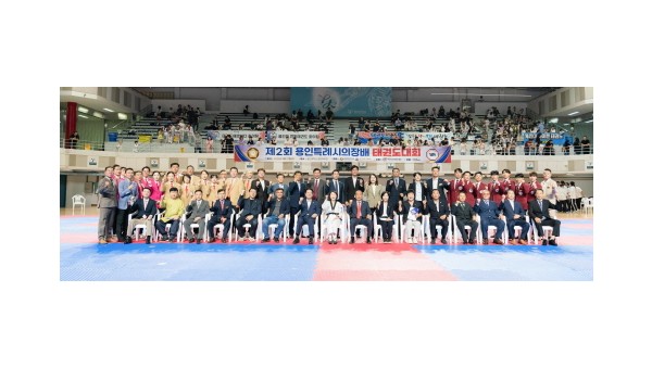 2025년 용인특례시의회 의장배 태권도대회가 27일 용인대학교 종합체육관에서 열렸다.2025년 용인특례시의회 의장배 태권도대회 참석자들과 태권도 시범단이 기념촬영을 하고 있다.이번 대회는 용인시체육회가 주최하고 용인시태권도협회가 주관했으며, 용인특례시와 용인특례시의회가 후원했다. 대회에…