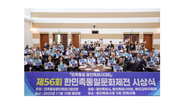 용인특례시(시장 이상일)는 10일 시청 컨벤션홀에서 민족통일 용인특례시협의회 주관으로 ‘민족통일 용인특례시대회와 제56회 한민족통일문화제전 시상식’이 열렸다고 밝혔다. 이상일 용인특례시장이 10일 시청 컨벤션홀에서 열린 민족통일 용인특례시대회에 참석해 축사를 하고 있다.이날 행…