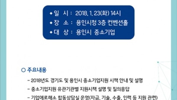 용인시는 관내 중소‧벤처기업의 생산성과 경쟁력 강화를 위해 23일 시청 컨벤션홀에서 ‘중소‧벤처기업 지원사업 합동설명회’를 개최했다고 밝혔다. ▲ 중소벤처기업지원사업설명회 경기도, 경기지방중소벤처…