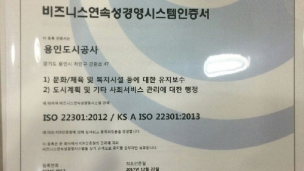 용인도시공사, 비즈니스 연속성 경영 시스템(BCMS) 인증 획득