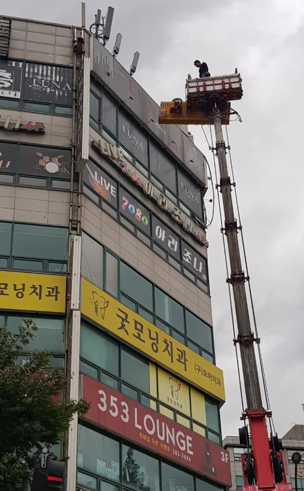 용인시는 17일 옥외 간판 추락으로 인한 안전사고를 예방하기 위해‘옥외간판의 벽면부착에 대한 구조검토 및 표준설계도 작성 용역’에 착수했다고 밝혔다. 추락 위험이 있는 옥외간판을 철거하는 모습 시는 이 용역을 통해 그동안 시공 업자의 경험에 의존해왔던 옥외간판 시공에 대한 객관적인 안전 시공 기준과 표준설계도 등을 마련할 방침이다. 용역은 ㈜두우엔지니어링이 오는 6월 중순까지 진행할 예정…