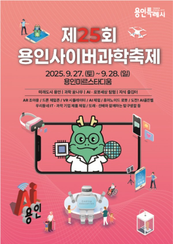 용인특례시(시장 이상일)는 27일부터 28일까지 용인미르스타디움‘에서 열리는 ’제30회 용인시민의 날‘ 행사에서 ’2025 용인사이버과학축제‘를 개최한다고 19일 밝혔다. 제25회 용인사이버과학축제 포스터AR 조아용 게임 포토존지난해 열린 용인시민의 날 행사에서 마련된 사이버과학축제 현장 모습’2025 용인사이버과학축제‘에서는 어린아이들이 직접 로봇과 과학기술을 경험할 수 있는 ▲AI·로봇 세상 탐험대 ▲미래도시 용인…