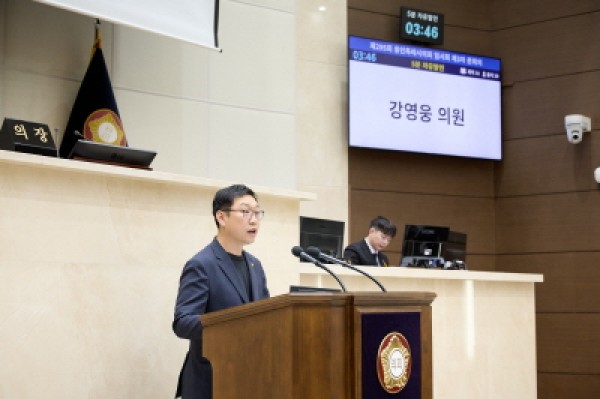 용인특례시의회 강영웅 의원(풍덕천1동, 풍덕천2동, 죽전2동/국민의힘)은 19일 열린 제295회 임시회 제3차 본회의 5분 자유발언을 통해 “도시계획심의위원회에서 수지구 의원이 제외된 것은 지역 대표성을 심각하게 훼손하는 결정”이라며 “수지구 관련 안건은 심의가 이뤄지지 않도록 조치해 달라”고 요청했다.용인특례시 강영웅 의원이 19일 열린 제295회 임시회 제3차 본회의에서 5분 자유발언을 하고 있다. 강 의원은 “그…